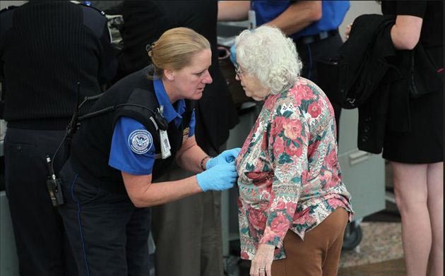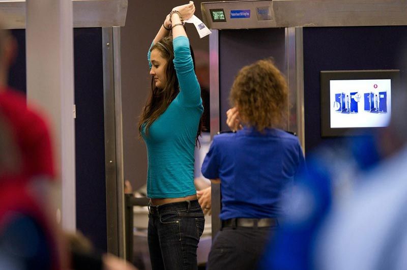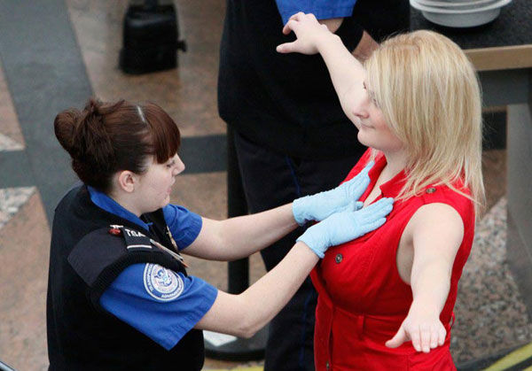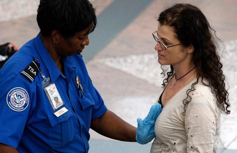 一名曾做過乳房切除手術的女子在北卡羅萊納州機場登機接受嚴密的人工安檢時,安檢人員甚至要求其掏出義乳檢查。圖為一名婦女在接受安檢。